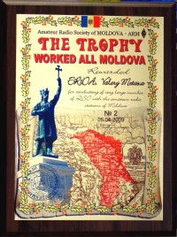 The plaque “Worked All Moldova Trophy” was created by Radio Amateur Association of Moldova and is presented to licensed radio amateurs all over the world for established (or heard if an SWL) two-way contacts (QSO) with amateur radio stations in Republic of Moldova – 60 (sixty) for Europe and 30 (thirty) for all other continents.